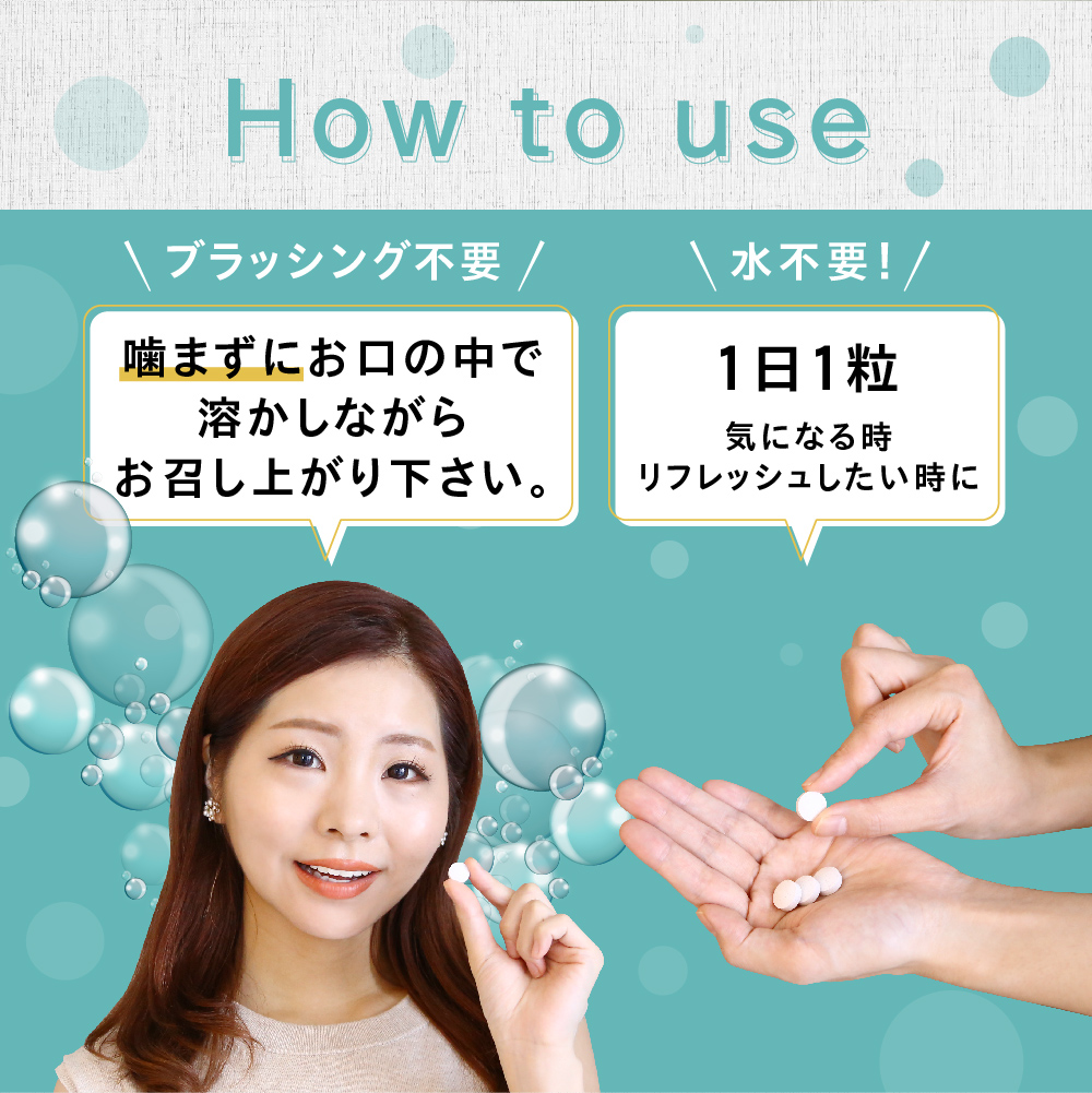 - お召し上がり方:健康補助の食品として1日1粒を目安に、口の中で溶かしてお召し上がりください。